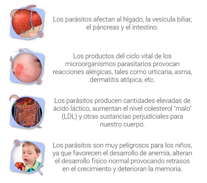 - Los parásitos producen cantidades elevadas de ácido láctico, aumentan el nivel colesterol «malo» (LDL) y otras sustancias perjudiciales para nuestro cuerpo.